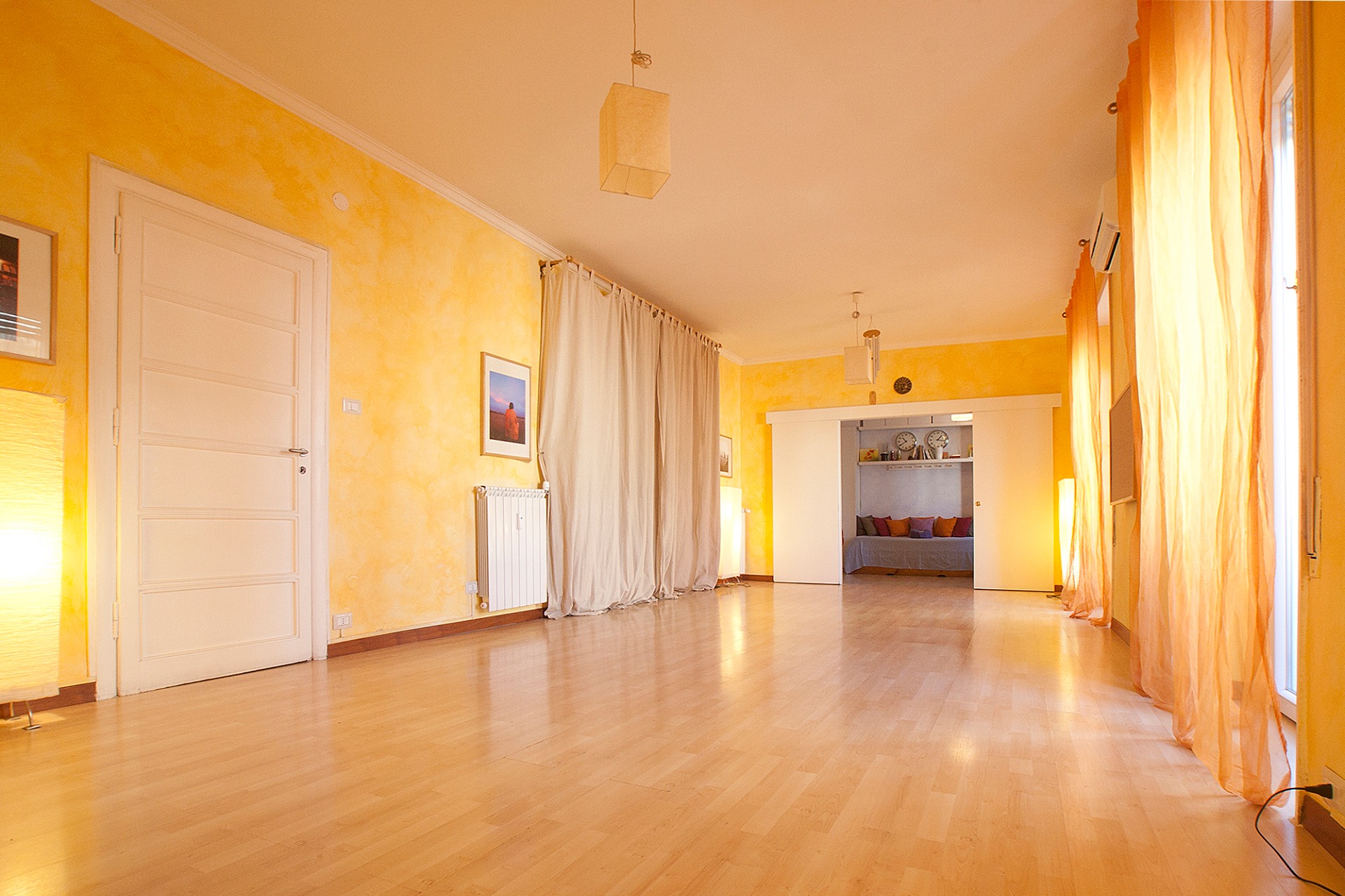 La sala per le attività di gruppo è luminosa, piacevolmente e naturalmente calda d'inverno e fresca l'estate anche grazie alla climatizzazione regolabile. Adeguatamente silenziosa, le sue dimensioni di otto metri e mezzo per quattro, consentono di avere il giusto numero di partecipanti per corsi di qualità e per avere la giusta attenzione e cura per ogni persona.